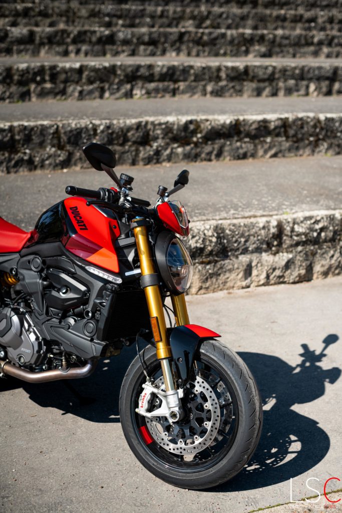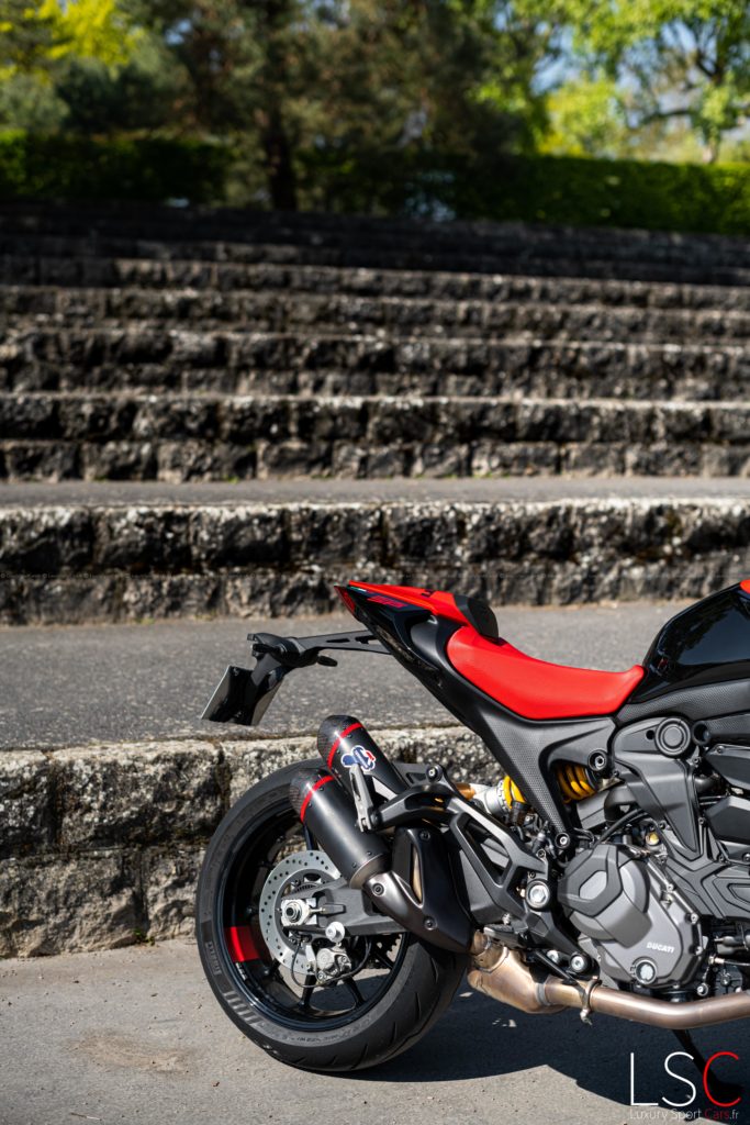 Le moteur V2 Testastretta de la Ducati Monster SP est un bloc très démonstratif. Cependant, en-dessous de 4000 tr/min, il peut être moins satisfaisant. Pour faire vivre pleinement ce moteur, il est recommandé de rester au-dessus de cette limite. Cette pratique ayant pour but d’avoir une réponse moteur la plus directe. Avec 111 chevaux à 9250 tours/min et 93 Nm de couple à 6500 tours/min, la Monster SP est propulsée par un couple à mi-régime très présent. La montée en régime est exponentielle, offrant une expérience excitante, tout comme la sonorité qui s’échappe des deux silencieux Termignoni. Ces échappements crachent dans les tours. Ils créent une sonorité envoûtante qui est renforcée par les petits retours de pots audibles à la décélération. On vous assure une pure symphonie motarde !